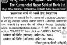 देहरादून : कुर्मांचल नगर सहकारी बैंक के सहायक वर्ग में भर्ती हेतु आया विज्ञापन