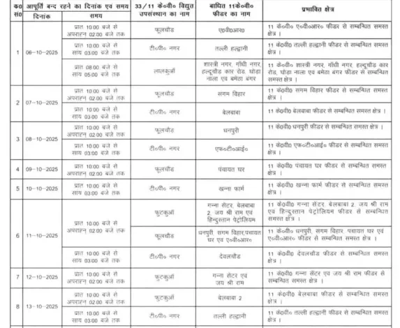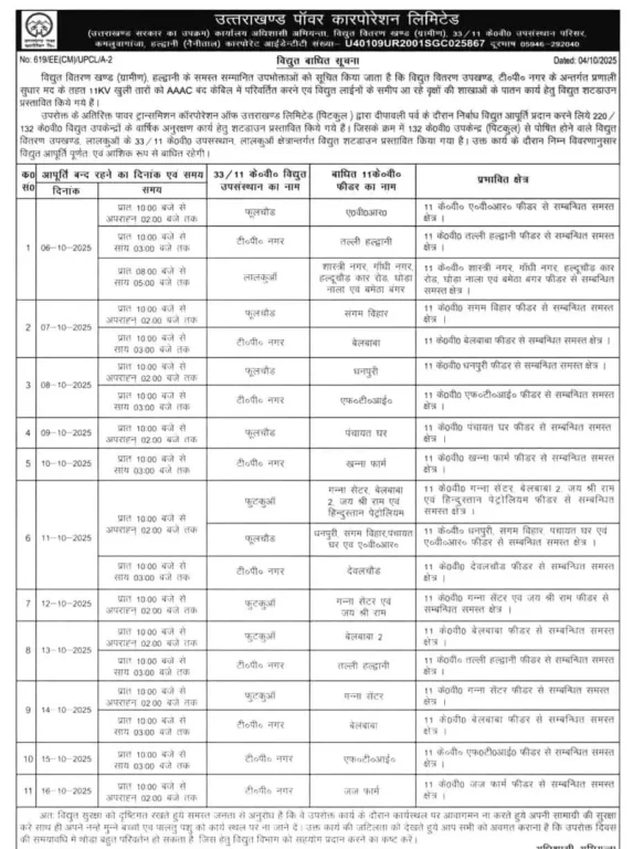 рд╣рд▓реНрджреНрд╡рд╛рдиреА рдореЗрдВ 6 рдЕрдХреНрдЯреВрдмрд░ рд╕реЗ 16 рдЕрдХреНрдЯреВрдмрд░ рддрдХ рдмрд┐рдЬрд▓реА рдХрдЯреМрддреА рдХрд╛ рд╢реЗрдбреНрдпреВрд▓ рдЬрд╛рд░реА рдХрд┐рдпрд╛ рдЧрдпрд╛ рд╣реИред рдЙрддреНрддрд░рд╛рдЦрдВрдб рдкрд╛рд╡рд░ рдХреЙрд░реНрдкреЛрд░реЗрд╢рди рд▓рд┐рдорд┐рдЯреЗрдб (UPCL) рдиреЗ рдЗрд╕ рдЕрд╡рдзрд┐ рдХреЗ рджреМрд░рд╛рди рд╢рд╣рд░ рдХреЗ рд╡рд┐рднрд┐рдиреНрди рдЗрд▓рд╛рдХреЛрдВ рдореЗрдВ рдмрд┐рдЬрд▓реА рдЖрдкреВрд░реНрддрд┐ рдкреНрд░рднрд╛рд╡рд┐рдд рд░рд╣рдиреЗ рдХреА рдЬрд╛рдирдХрд╛рд░реА рджреА рд╣реИред рдпрд╣ рдХрдЯреМрддреА рдкреБрд░рд╛рдиреЗ рддрд╛рд░реЛрдВ рдФрд░ рдХрдиреЗрдХреНрд╢рди рдХреЛ рд╣рдЯрд╛рдХрд░ рдПрд░рд┐рдпрд▓ рдмрдВрдЪ рдХреЗрдмрд▓ (ABC) рддрдХрдиреАрдХ рд╕реЗ рдмрджрд▓рдиреЗ рдХреЗ рд▓рд┐рдП рдХреА рдЬрд╛ рд░рд╣реА рд╣реИ, рдЬрд┐рд╕рд╕реЗ рднрд╡рд┐рд╖реНрдп рдореЗрдВ рдмрд┐рдЬрд▓реА рдХреА рдЧреБрдгрд╡рддреНрддрд╛ рдФрд░ рд╕реБрд░рдХреНрд╖рд╛ рдореЗрдВ рд╕реБрдзрд╛рд░ рд╣реЛрдЧрд╛ред