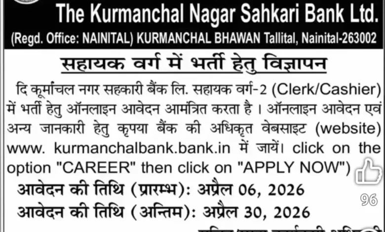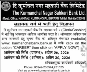 दि कूर्मांचल नगर सहकारी बैंक लि. सहायक वर्ग-2 (Clerk/Cashier) में भर्ती हेतु ऑनलाइन आवेदन आमंत्रित करता है । ऑनलाइन आवेदन एवं अन्य जानकारी हेतु कृपया बैंक की अधिकृत वेबसाइट (website) www. kurmanchalbank.bank.in में जायें। click on the option “CAREER” then click on “APPLY NOW”)
