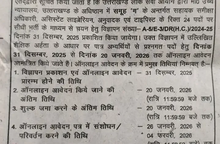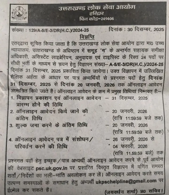 एतद्वारा सूचित किया जाता है कि उत्तराखण्ड लोक सेवा आयोग द्वारा मा० उच्च न्यायालय, उत्तराखण्ड के अधिष्ठान में समूह ‘ग’ के अन्तर्गत सहायक समीक्षा अधिकारी, असिस्टेंट लाइब्रेरियन, अनुवादक एवं टाइपिस्ट के रिक्त 24 पदों पर सीधी भर्ती के माध्यम से चयन हेतु विज्ञापन संख्या- A-5/E-3/DR (H.C.)/2024-25 दिनांक 31 दिसम्बर, 2025 प्रकाशित किया जायेगा। उक्त विज्ञापन में उल्लिखित शैक्षिक अर्हता के आधार पर पात्र अभ्यर्थियों से प्रश्नगत पदों हेतु दिनांक 31 दिसम्बर, 2025 से दिनांक 20 जनवरी, 2026 तक ऑनलाइन आवेदन आमांत्रित किये जाते हैं। ऑनलाइन आवेदन के क्रम में प्रमुख तिथियां निम्नवत् हैः-