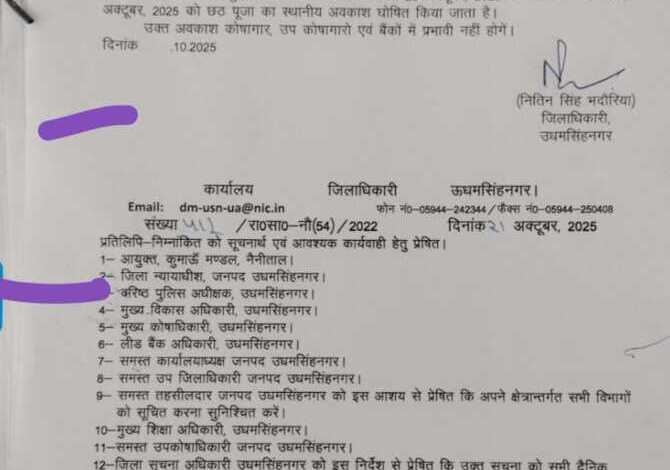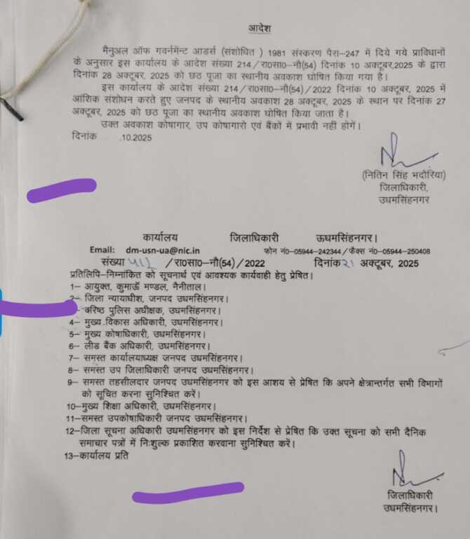 छठ पर्व को लेकर जिला प्रशासन ने अहम निर्णय लेते हुए स्थानीय अवकाश घोषित करने के निर्देश जारी किए हैं जिला अधिकारी उधम सिंह नगर के द्वारा जारी आदेश के तहत मैनुअल ऑफ गवर्नमेन्ट आडर्स (संशोधित) 1981 संस्करण पैरा-247 में दिये गये प्राविधानों के अनुसार इस कार्यालय के आदेश संख्या 214/रा0सा0-नौ (54) दिनांक 10 अक्टूबर, 2025 के द्वारा दिनांक 28 अक्टूबर, 2025 को छठ पूजा का स्थानीय अवकाश घोषित किया गया है।