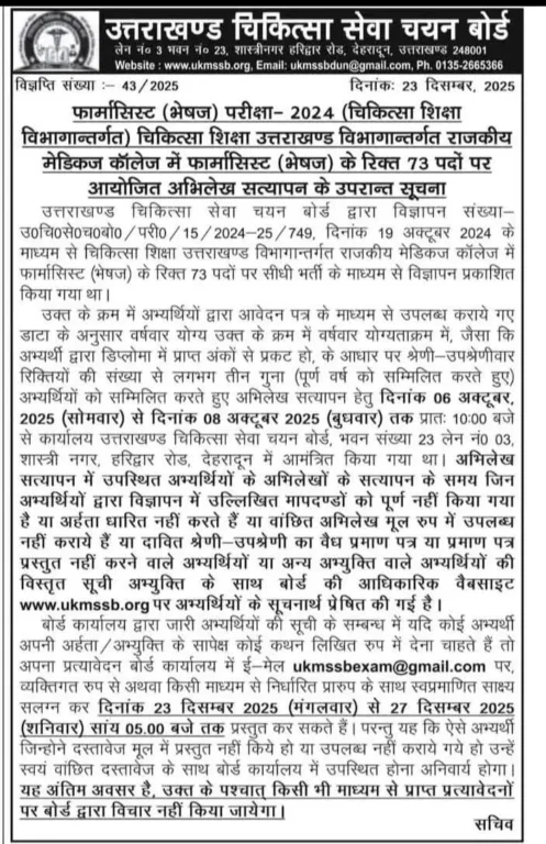 एतद्वारा सूचित किया जाता है कि उत्तराखण्ड लोक सेवा आयोग द्वारा मा० उच्च न्यायालय, उत्तराखण्ड के अधिष्ठान में समूह ‘ग’ के अन्तर्गत वैयक्तिक सहायक के रिक्त 11 पदों पर सीधी भर्ती के माध्यम से चयन हेतु विज्ञापन संख्या-A-4/E-3/DR(H.C.PA)/2024-25, दिनांक 25 दिसम्बर, 2025 को प्रकाशित किया गया है। उक्त विज्ञापन में उल्लिखित शैक्षिक अर्हता के आधार पर पात्र अभ्यर्थियों से प्रश्नगत पदों हेतु दिनांक 25 दिसम्बर, 2025 से दिनांक 14 जनवरी, 2025 तक ऑनलाइन आवेदन पत्र आमंत्रित किये जाते हैं। ऑनलाइन आवेदन के क्रम में प्रमुख तिथियां निम्नवत् हैः-