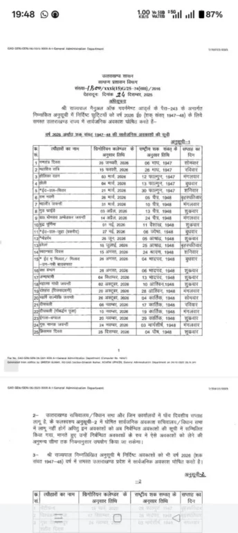 श्री राज्यपाल मैनुअल ऑफ गवर्नमेण्ट आर्ट्स के पैरा-243 के अन्तर्गत निम्नांकित अनुसूची में निर्दिष्ट छुट्टियों को वर्ष 2026 ई० (शक् संवत् 1947-48) के लिये समस्त उत्तराखण्ड राज्य में सार्वजनिक अवकाश घोषित करते हैं-