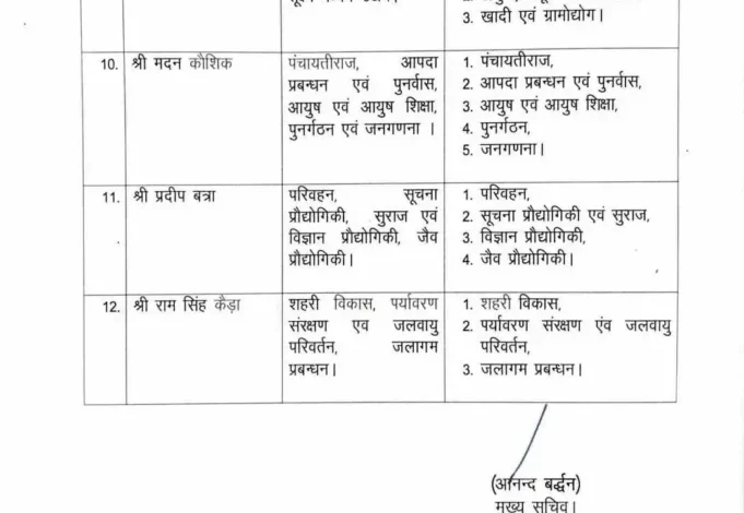 वहीं, अन्य विभागों का बंटवारा मंत्रियों के बीच करते हुए उन्हें उनके-उनके दायित्व सौंपे गए हैं, ताकि विभागीय कार्यों का प्रभावी क्रियान्वयन सुनिश्चित हो सके। सूत्रों के अनुसार इस नए बंटवारे से कार्यों में बेहतर समन्वय स्थापित होगा और विकास योजनाओं को तेजी से धरातल पर उतारा जा सकेगा।