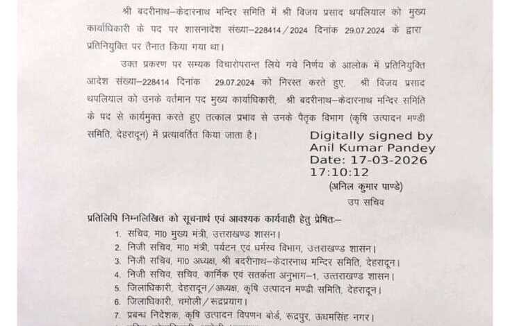 उत्तराखण्ड शासन के पर्यटन अनुभाग-1 ने बड़ा प्रशासनिक निर्णय लेते हुए श्री बदरीनाथ-केदारनाथ मंदिर समिति के मुख्य कार्याधिकारी (सीईओ) विजय प्रसाद थपलियाल को उनके पद से हटा दिया है। शासन द्वारा जारी कार्यालय आदेश के अनुसार उनकी प्रतिनियुक्ति को निरस्त कर दिया गया है।