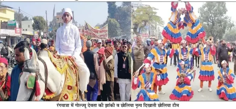 रंगयात्रा में गोल्ज्यू देवता की झांकी व छोलिया नृत्य दिखाती छोलिया टीम