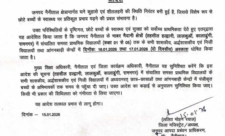 उक्त परिस्थितियों के दृष्टिगत, छोटे बच्चों के स्वास्थ्य एवं सुरक्षा को सर्वोच्च प्राथमिकता देते हुए एतद्वारा यह आदेशित किया जाता है कि जनपद नैनीताल के भाबर मैदानी क्षेत्रों (तहसील हल्द्वानी, लालकुआ, कालाढुंगी, रामनगर) में संचालित समस्त प्राथमिक विद्यालयों (कक्षा 01 से 05) तक के सभी शासकीय, अर्द्धशासकीय एवं निजी विद्यालयों तथा आंगनबाड़ी केन्द्रों में दिनॉकः 16.01.2026 तथा 17.01.2026 (दो दिवसीय) अवकाश घोषित किया जाता है।
