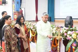 The programme commenced with the ceremonial illumination of the lamp, officiated by Dr. Harish Rautela, the esteemed Chief Guest and Gp Capt Vijay Singh Dangwal, the Principal of Sainik School Ghorakhal, accompanied by the First Lady, Mrs. Sweta Dangwal. This poignant ceremony epitomized the dispelling of darkness and the ascendancy of knowledge. It was subsequently followed by a graceful rendition of Saraswati Vandana, performed by the girl cadets, which fostered a tranquil and reverent atmosphere.