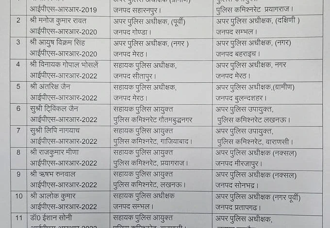 लिपि नागयाच को वाराणसी, राजकुमार मीणा को मिर्जापुर और ऋषभ रुनवाल को सोनभद्र में जिम्मेदारी दी गई है। इसके अलावा आलोक कुमार प्रतापगढ़, ईशान सोनी जालौन और मयंक पाठक सहारनपुर में एएसपी बनाए गए हैं। पढ़ें पूरी लिस्ट…