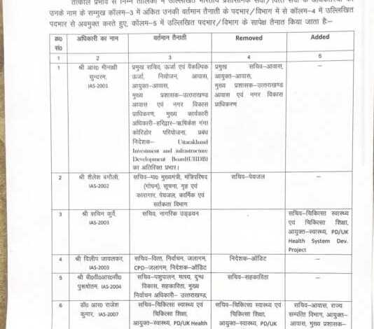 उत्तराखंड से इस वक्त की बड़ी खबर सामने आ रही है। शासन ने बड़े पैमाने पर आईएएस और पीसीएस अधिकारियों की तैनाती में बड़ा फेरबदल किया है।