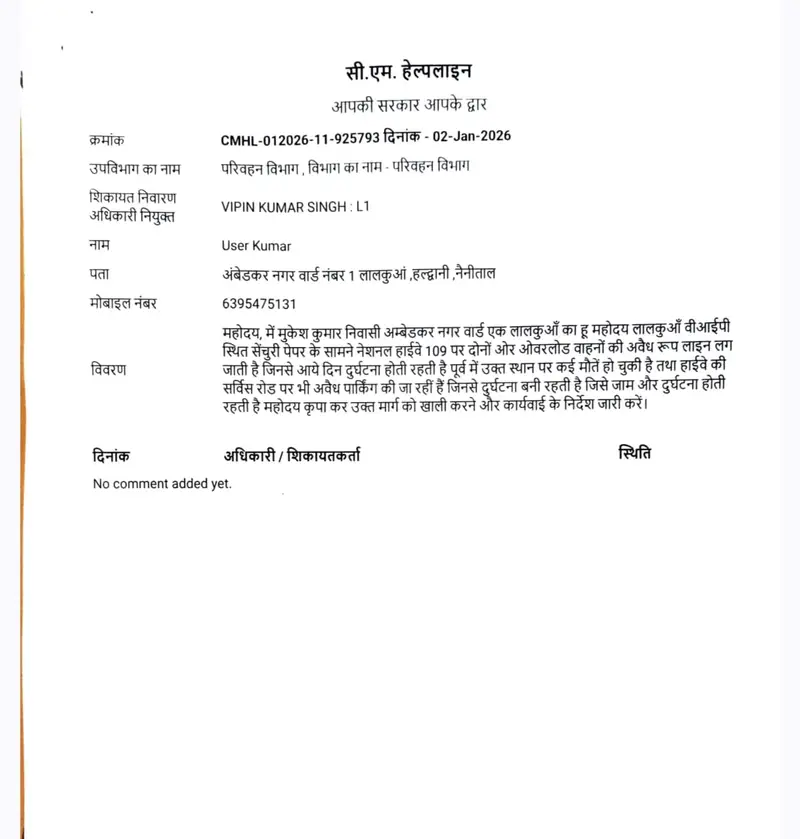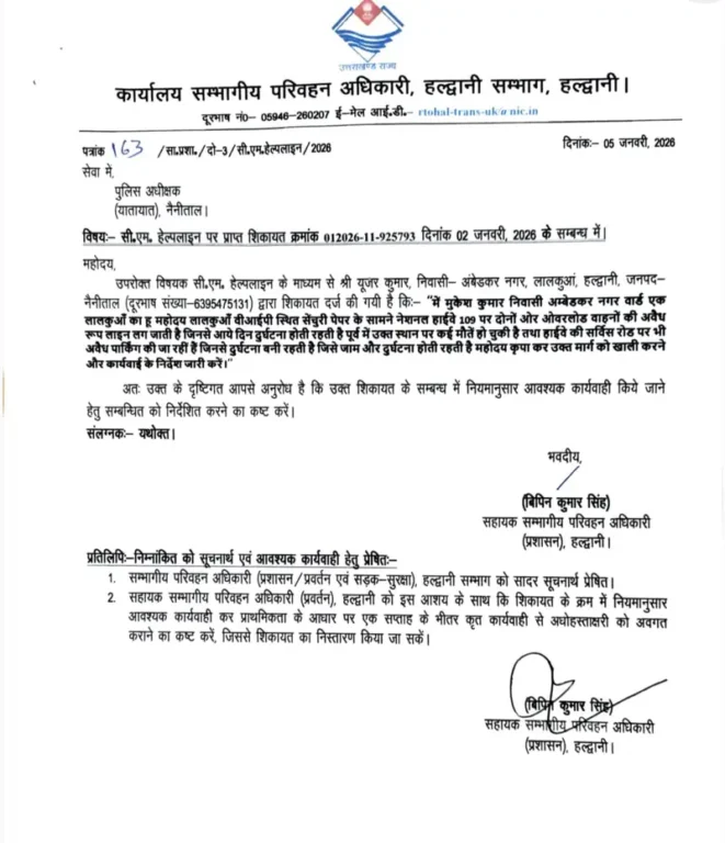 यहाँ मुख्यमंत्री हेल्पलाइन पर दर्ज शिकायत के आधार पर कार्यालय सहायक सम्भागीय परिवहन अधिकारी (प्रशासन) हल्द्वानी ने पुलिस अधीक्षक यातायात समेत संबंधित विभागों को नियमित प्रवर्तन, सख्त कार्रवाई और व्यवस्था दुरुस्त करने के स्पष्ट आदेश जारी कर दिए हैं।