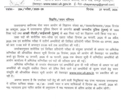 12 जनवरी, 2026 से 18 फरवरी, 2025 तक अभ्यर्थियों के अभिलेखों की जांच एवं पदों की वरीयता पूछी गई। अभिलेखों के जांच के उपरांत श्रेष्ठताक्रम एवं अभ्यर्थियों द्वारा दी गयी वरीयता के आधार पर अर्ह अभ्यर्थियों की औपबंधिक श्रेष्ठता सूची आयोग की वेबसाइट www.sssc.uk.gov.in पर प्रकाशित कर दी गई है।