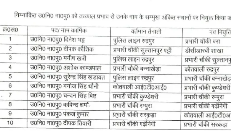 रुद्रपुर- एसएसपी उधमसिंहनगर अजय गणपति ने किए तबादले