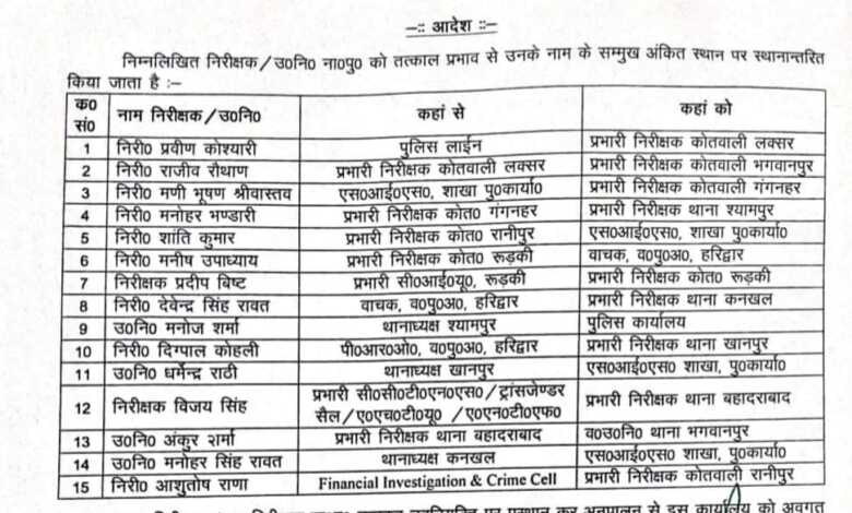 हरिद्वार। एसएसपी प्रमेंद्र सिंह डोभाल ने बुधवार देर शाम जनपद के 11 निरीक्षक व 4 उप निरीक्षकों के तबादले किए हैं।