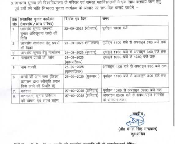 विश्वविद्यालय के परिसरों एवं सभी सम्बद्ध महाविद्यालयों में एक साथ चुनाव कराये जाने हेतु पूर्व वर्षों की भाँति विस्तृत कार्यक्रम तय किया गया है। जिसके अनुसार चुनाव कार्यक्रम संपादित किया जाएगा। इसके अन्तर्गत छात्रसंघ चुनाव सम्बन्धी अधिसूचना 22 सितम्बर, 2025 (सोमवार) को प्रातः 10:00 बजे जारी होगी। छात्र संघ नामांकन हेतु प्रपत्रों की बिक्री 23 सितम्बर 2025 (मंगलवार) को पूर्वान्ह 11:बजे अपराह्न 3.00 बजे तक की जाएगी।