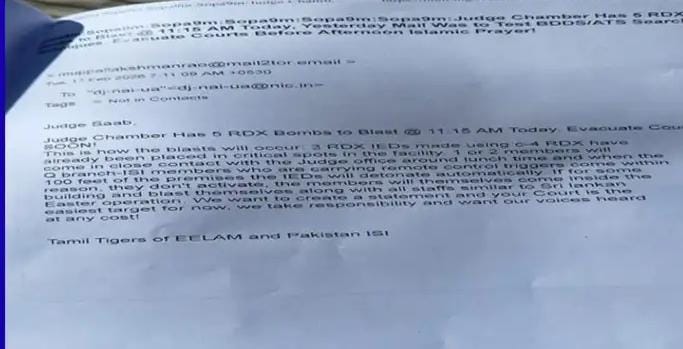 जज चैंबर के पास आज सुबह 11:15 बजे विस्फोट करने के लिए 5 आरडीएक्स हैं, कल मेल बीडीडीएस/एटीएस खोज प्रश्नों का परीक्षण करने के लिए था। दोपहर की इस्लामी प्रार्थना से पहले अदालतें खाली कर दें। जज साब, जज चैंबर में आज सुबह 11:15 बजे विस्फोट करने के लिए 5 आरडीएक्स बम हैं। कोर्ट को जल्द खाली करें!