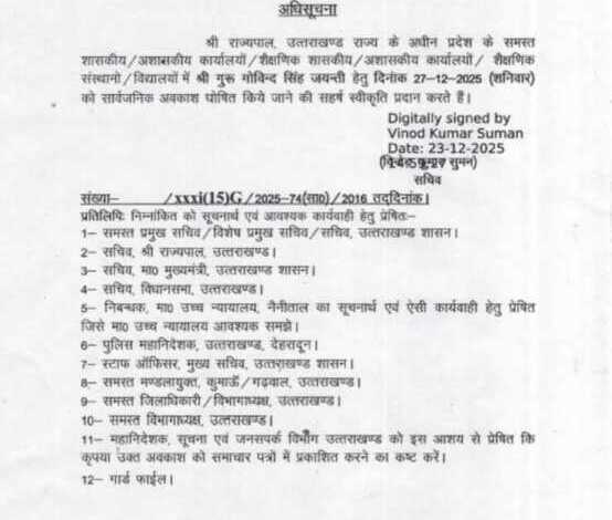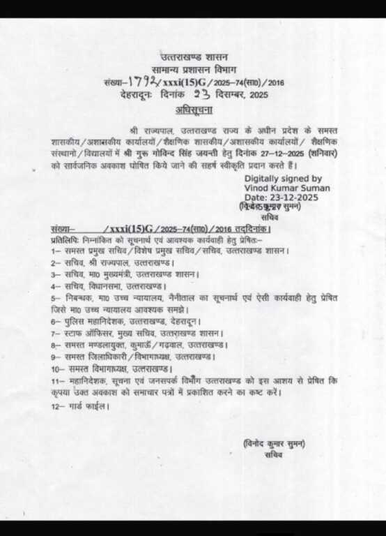 Dehradun News: उत्तराखंड सरकार ने गुरु गोविंद सिंह की जयंती के अवसर पर 27 दिसम्बर 2025 को सार्वजनिक अवकाश घोषित किया है। गुरु गोविंद सिंह सिख धर्म के दसवें गुरु थे और उनकी जयंती को पूरे देश में बड़े उत्साह के साथ मनाया जाता है।