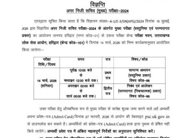 ने अपर निजी सचिव अंतर्गत मुख्य परीक्षा को लेकर अपडेट जारी की है अब यह परीक्षा 14 मार्च को होगी इसकी अधिसूचना जारी की गई