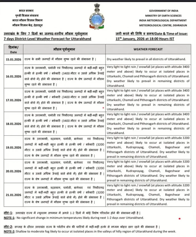 16 से 21 जनवरी 2026 के दौरान 3200 से 3400 मीटर ऊंचाई वाले क्षेत्रों में हो सकती है बारिश-बर्फबारी।