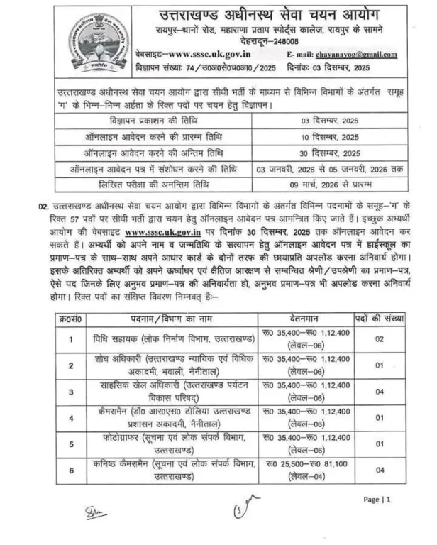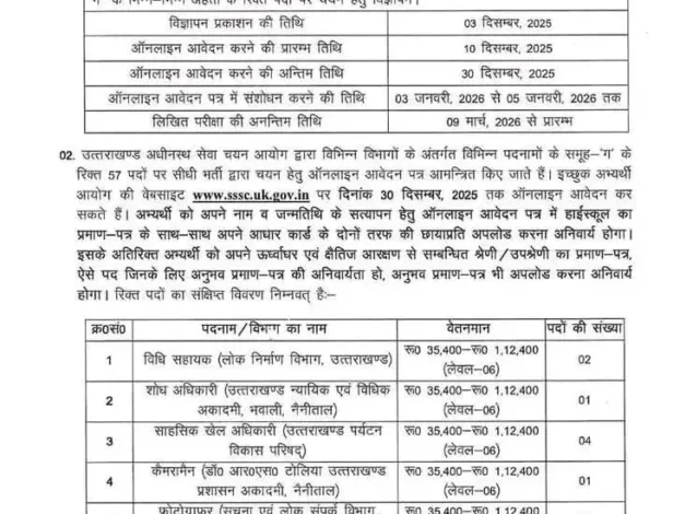 UKSSSC JOB: उत्तराखंड अधीनस्थ सेवा चयन आयोग ने राज्य के विभिन्न विभागों में कुल 57 पदों पर भर्ती का नोटिफिकेशन जारी किया है। इन पदों में मनोवैज्ञानिक, पर्यटन अधिकारी, कंप्यूटर प्रोग्रामर, प्रशिक्षक, अनुदेशक, कैमरा मैन, फोटो कॉपी मशीन ऑपरेटर, और जूनियर तकनीकी सहायक जैसे पद शामिल हैं।